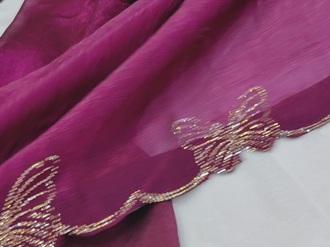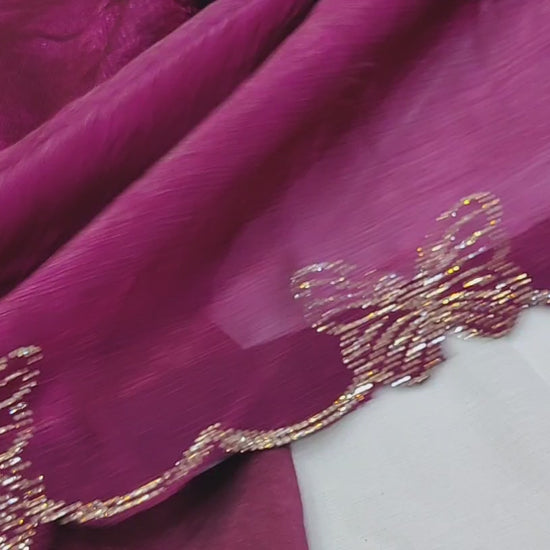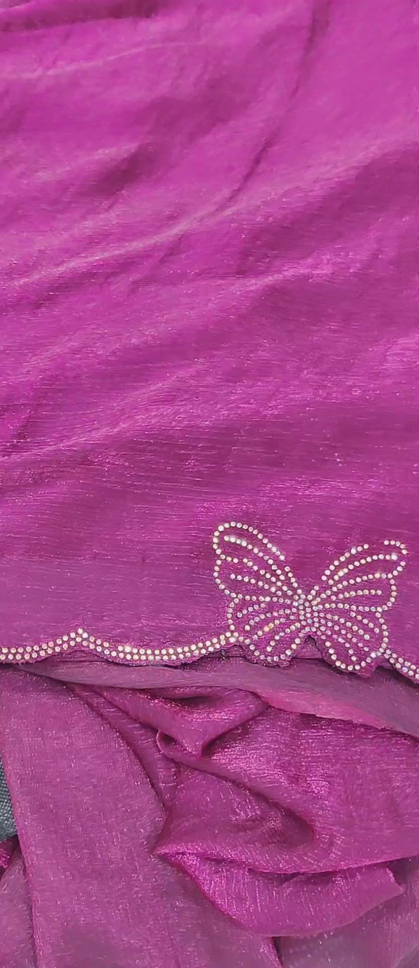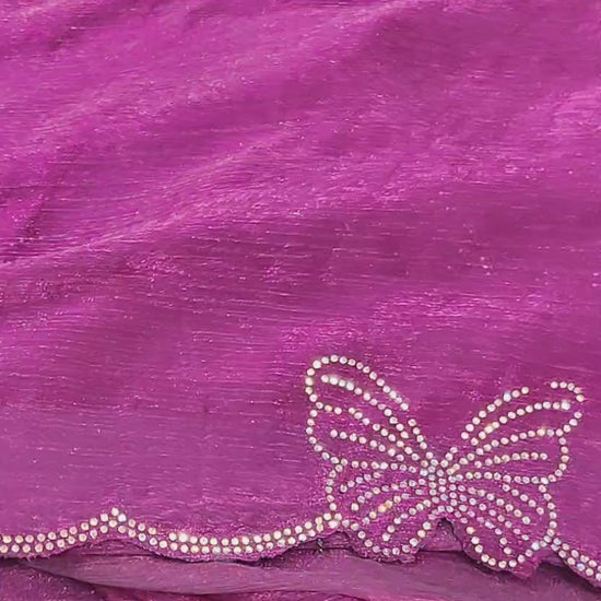 The highlight of this masterpiece is its hand-embellished butterfly border, designed with delicate crystal and beadwork that sparkles with every movement. The rich magenta hue adds a bold, regal touch, making it an ideal pick for festive celebrations, weddings, parties, and special events.